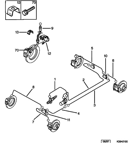 ABS:ittomasta mallista lienee nyt puhe. Karttaa ei ole tarjota, mutta Servicehän tarjoaa tämmöisen karkean piirroksen jarruputkista ja lisäksi kuvan poljinventtiilistä. Itse en käy veikkaamaan aavistuksen perusteella, mihin liitäntään tuossa takajarrujen paineputki tulee, kun en ole moista ikinä joutunut vaihtamaan. Sanokoot sen siis joku asian varmasti tietävä. Tässä on kuitenkin materiaali käytettäväksi.