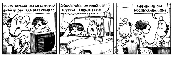 Laskin voileivän apukuskin penkille ja tavoitin katsekontaktin rekkamieheen. Nostaessani oikean käteni tervehdykseen, keskisormeni osui taustapeilissä roikkuneeseen Pirellin tyttökalenteriin, joka putosi etupenkkien väliin kaataen siinä olleen viinipullon. Vaikka pullossa oli vain tilkkanen jäljellä, riitti se kastelemaan pilalle ristikkolehden, jonka olin ostanut Kiteeltä ja jonka olin saanut jo melkein täytettyä. Sitten kännykkäni soi. Tavoittaakseni kännykkäni penkin alta, en pystynyt enää ohjaamaan autoa polvillani, vaan minun oli laskettava kahvimuki kädestäni ja tartuttava rattiin vasemmalla kädelläni. Yrittäessäni hapuilla puhelintani penkin alta, käteni osui johtonippuun, jolloin ajovalot sammuivat. Myös radio ja matka-TV vaikenivat. Moottoritie oli valaistu, joten ajokaistat erottuivat melko selvästi sakeasta lumisateesta huolimatta. Kokeillessani äänimerkkiä, sähkölaitteet alkoivat jälleen toimia ja ehdin juuri ja juuri nähdä SaiPa:n tekemän hienon voittomaalin (2-1) Pelicaaneja vastaan. Pääsin rivakasti rekan ohi, juuri sopivasti ennen Niskan poistumisramppia. Myöhemmin kotona, asuntovaunussa olleet lapseni kertoivat, että rekkakuski oli jatkanut partansa ajamista vielä ohituksemme jälkeenkin.